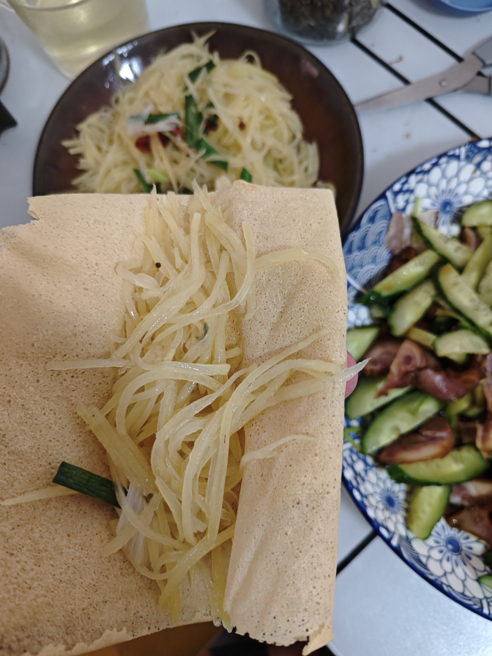 吃卷菜,特别是自制的朝天锅,煎饼反倒是一个好的选择。