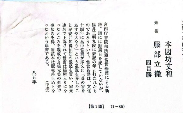 这是根据宫内厅书陵部所藏的当代棋谱整理而成的新谱。棋谱上虽未记载对局日期,但福井正明九段推测,这盘棋应该是在所标注的年份进行的。《当世棋谱》是一本珍稀棋书,文化十四年时,畠中哲斋在为其所作的序言中,以“围棋的危害可不小”这样一种反语来调侃,这激怒了安井知得仙知。随后,四大家(本因坊家、安井家、井上家、林家)联名上书申诉,导致畠中哲斋被关进扬屋(江户时代拘留轻罪者的地方)。后来,在亲戚舟桥元美的多方奔走下,事情才得以平息,而这本《当世棋谱》也被禁止销售。